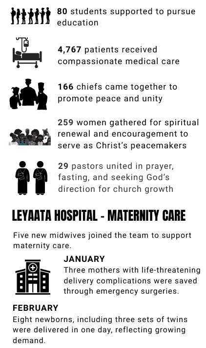 This year, our primary focus remains on capacity building—through the continued support of Leyaata Hospital and the development of the Leyaata Education & Research Network (LEARN) Centre.